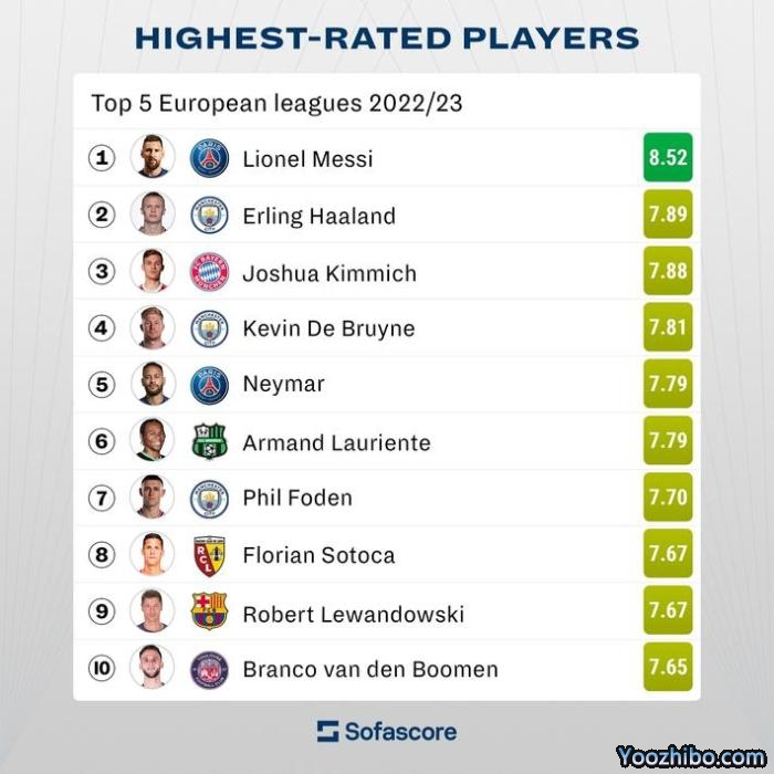 24直播网10月18日消息,数据网站Sofascore更新了2022-23赛季欧洲五大联赛球员评分排行榜,梅西以8.52分列第一,哈兰德第二。