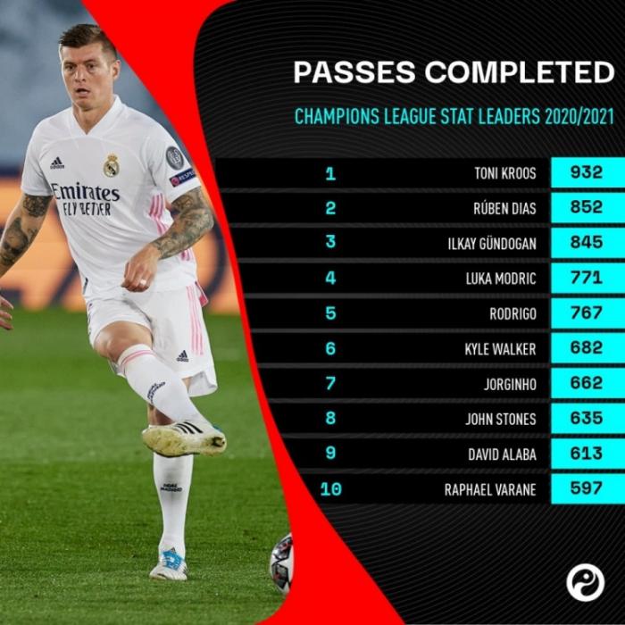 传球榜:传球方面,皇马的克罗斯以932次传球排名榜首,而第二的迪亚斯只有852次,随后是京多安、莫德里奇、罗德里、凯尔沃克、若日尼奥、斯通斯、阿拉巴和瓦拉内。曼城真的是把传球进行到底了,传球榜前十的球员中,有一半来自曼城,不过可惜的是在决赛他们没有掌握住局势。